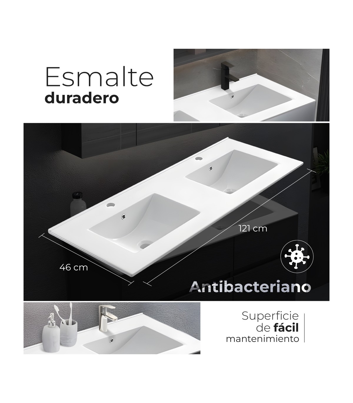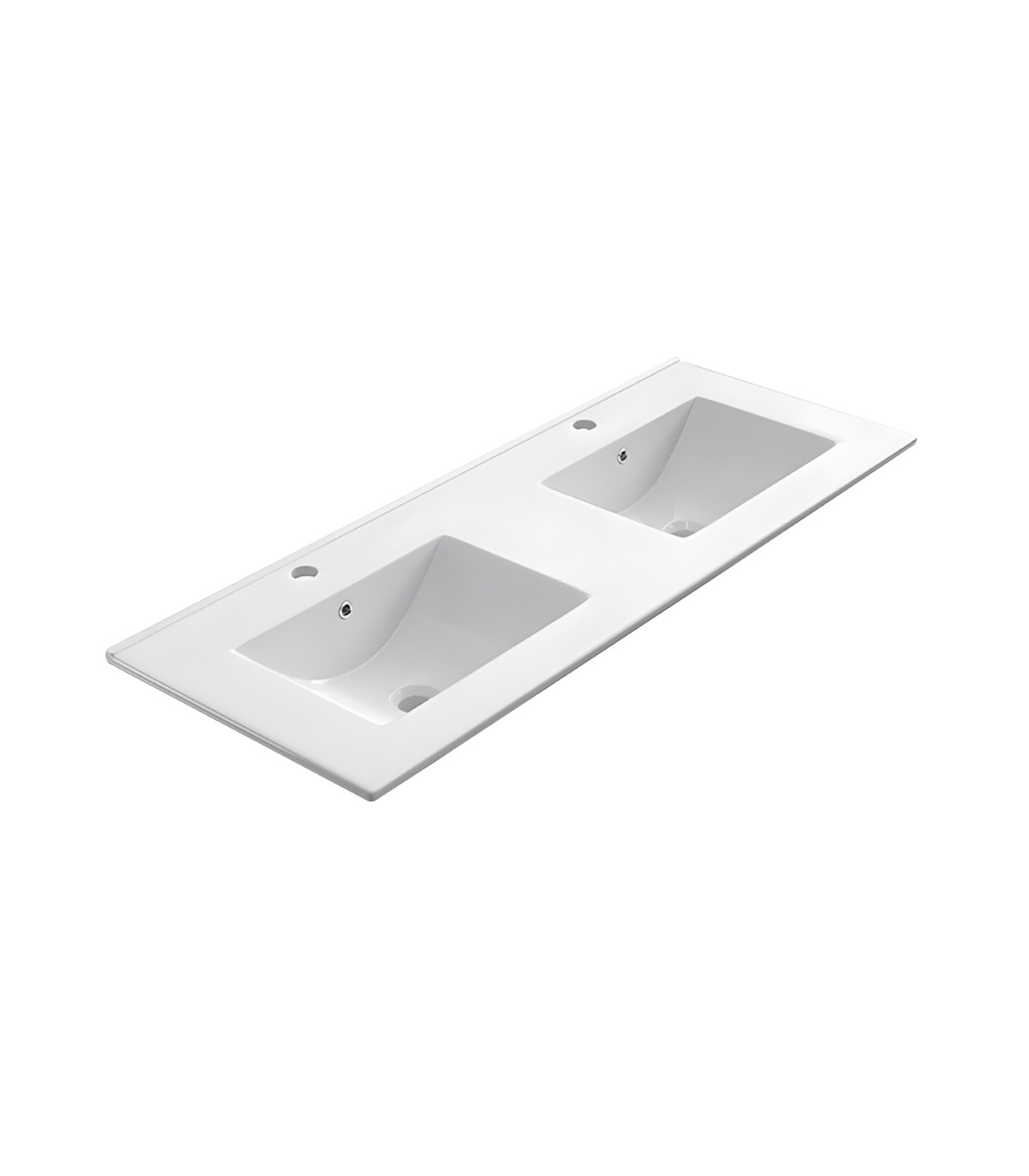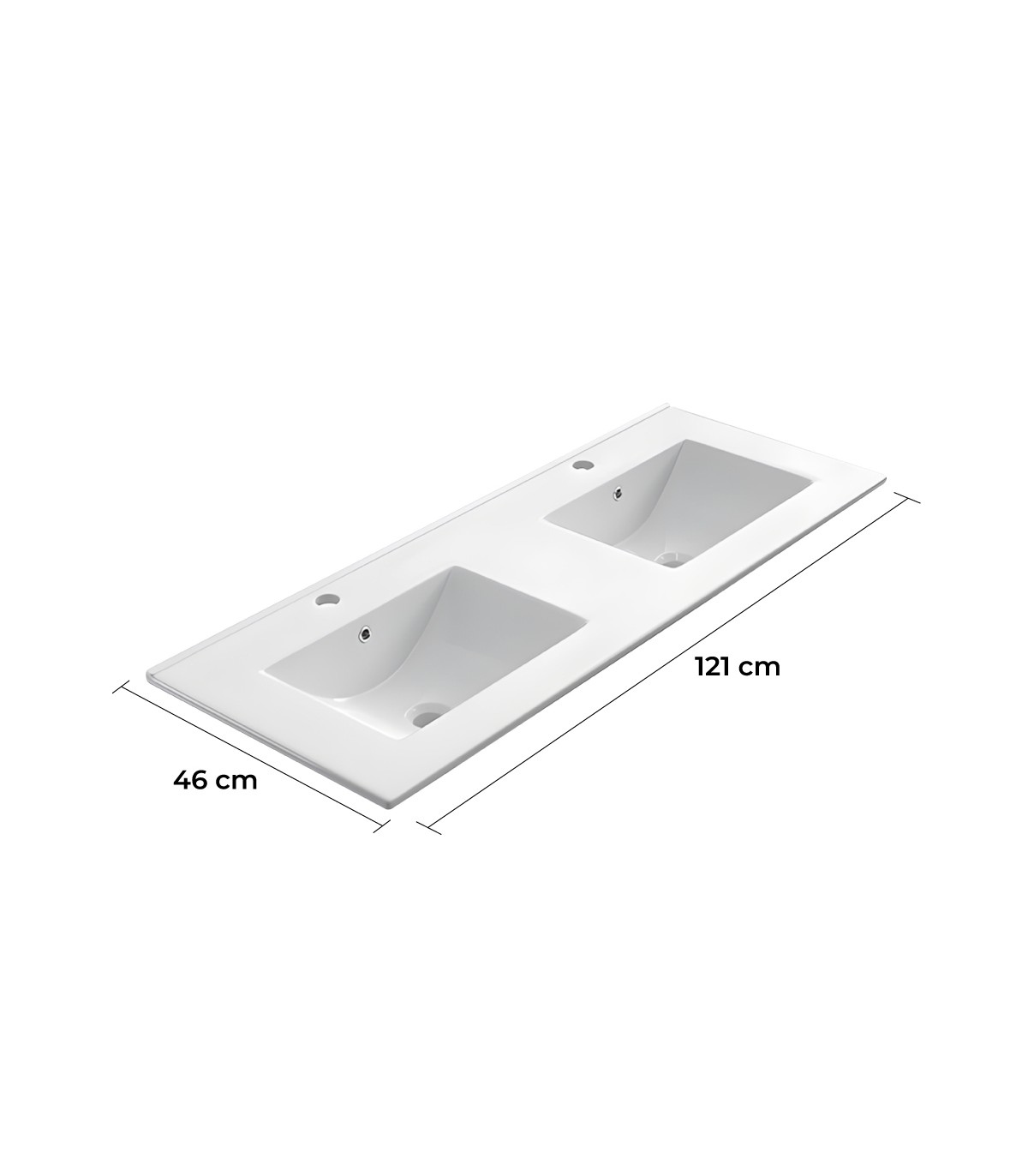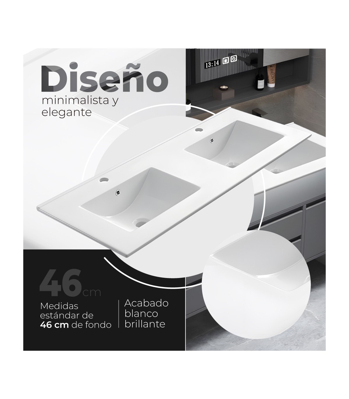 Encimera de porcelana blanca de 120 cm con dos senos, fabricada en porcelana vitrificada de alta calidad. Amplia, resistente y fácil de limpiar, ideal para baños compartidos. Entrega rápida 48–72 h.