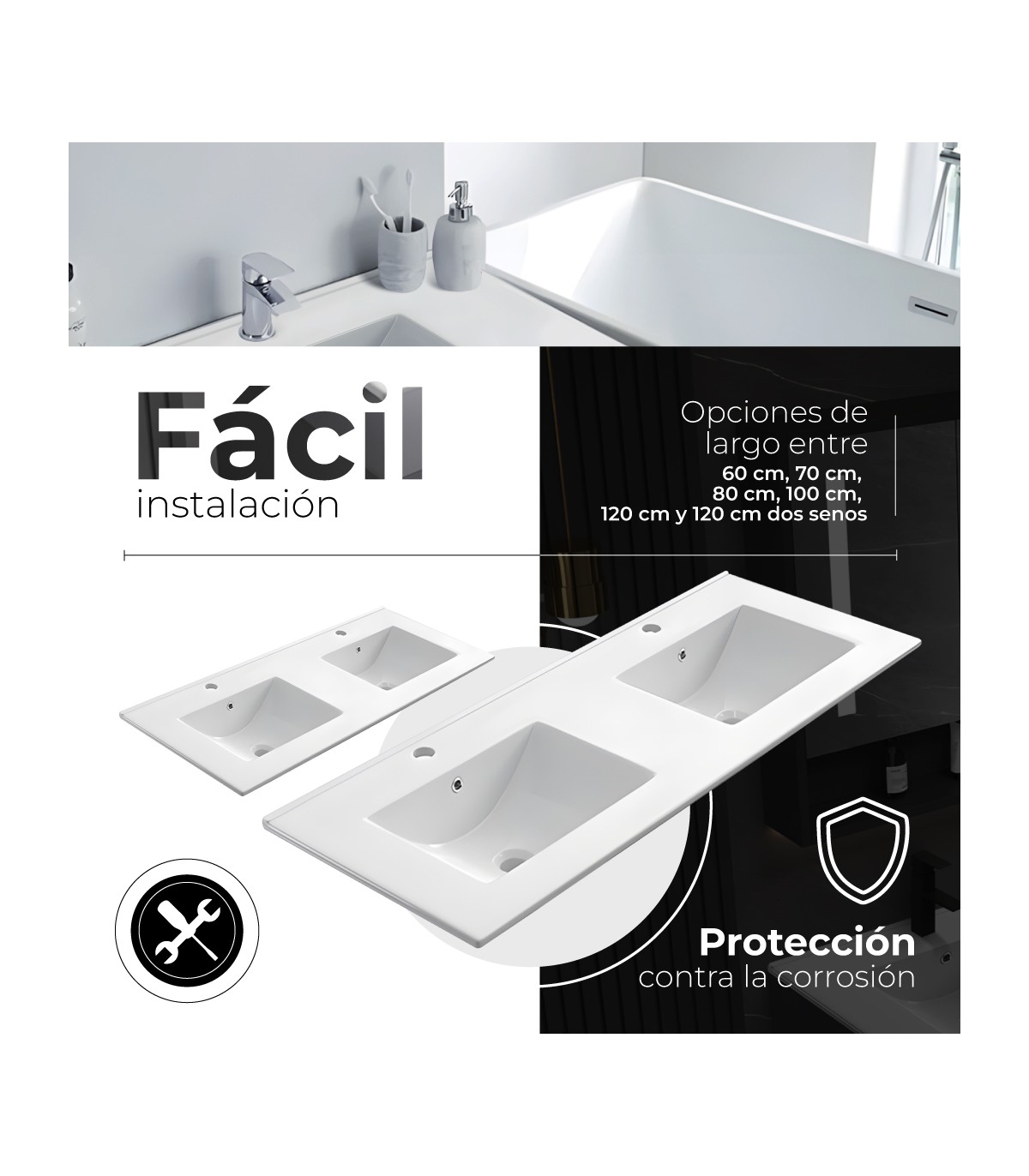 La encimera está diseñada para una instalación sencilla sobre mueble de baño compatible. Su formato de dos senos la hace especialmente adecuada para proyectos de reforma o nuevas instalaciones que requieren un uso compartido.