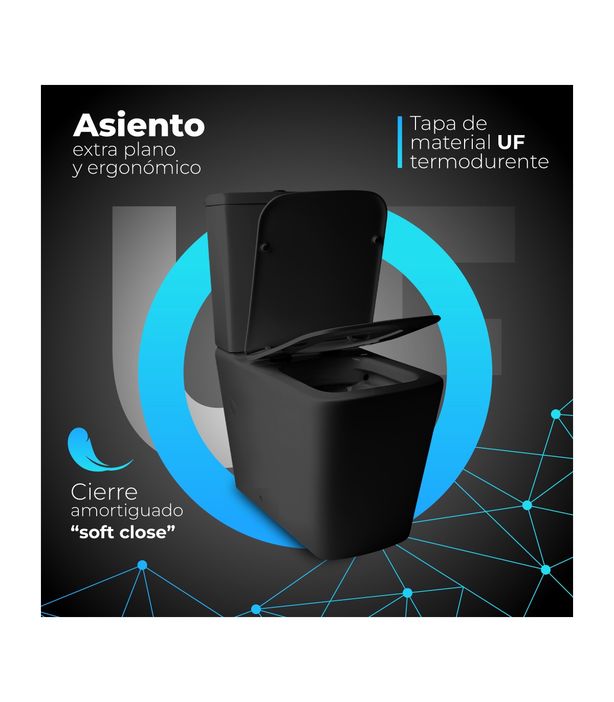 La tapa amortiguada UF garantiza un cierre suave y silencioso, aportando mayor confort y durabilidad. El sistema de doble descarga permite reducir el consumo de agua sin renunciar al rendimiento.