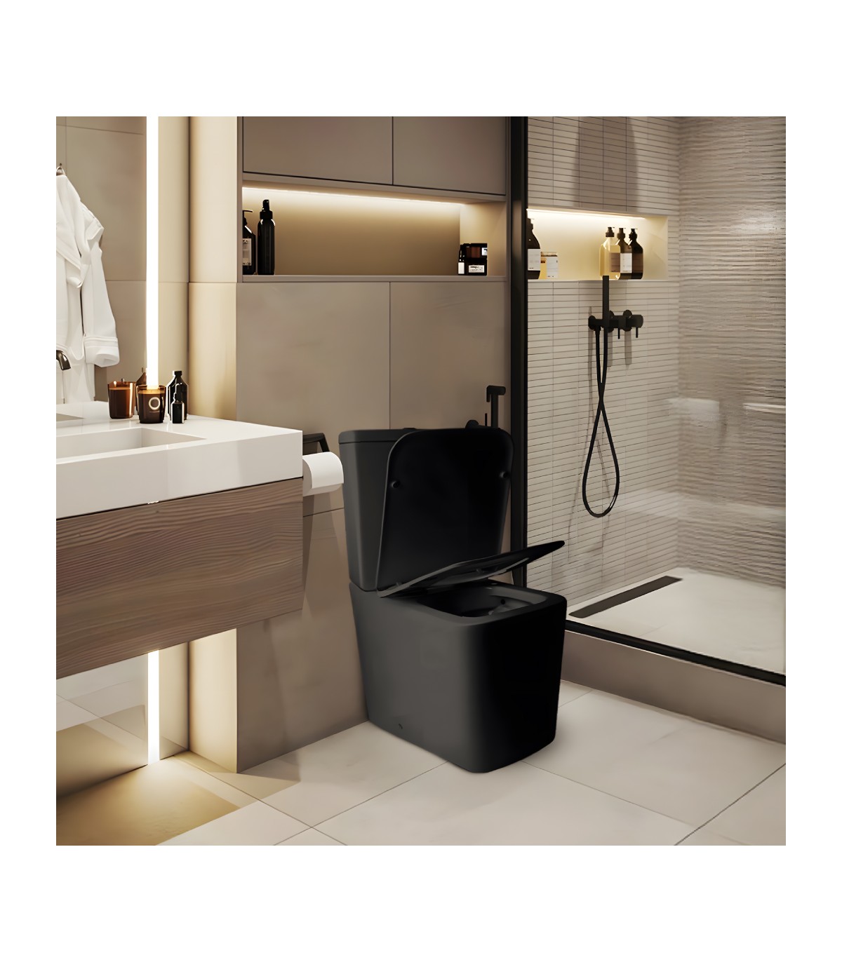 Pack inodoro completo compacto Paris de cerámica negra con diseño square, sistema rimless, salida dual y doble descarga 3/6 L. Incluye tapa amortiguada UF desmontable. Entrega rápida 48–72h.
