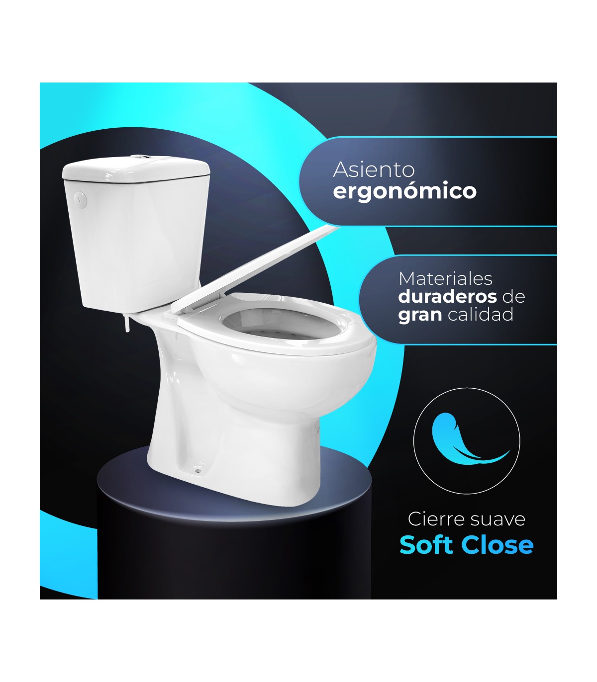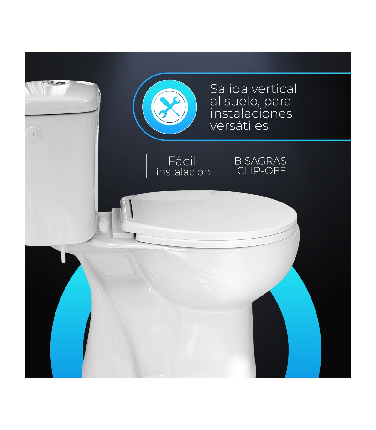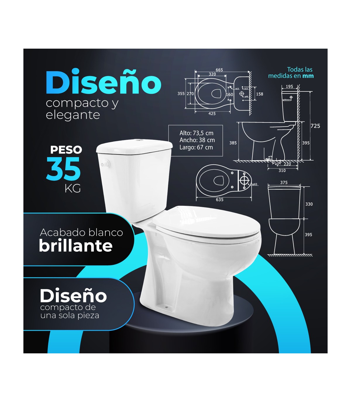 Este modelo se suministra como pack completo, incluyendo mecanismo de descarga con doble pulsador 3/6 L, tapa con asiento y anclajes al suelo, facilitando una instalación rápida y sencilla.