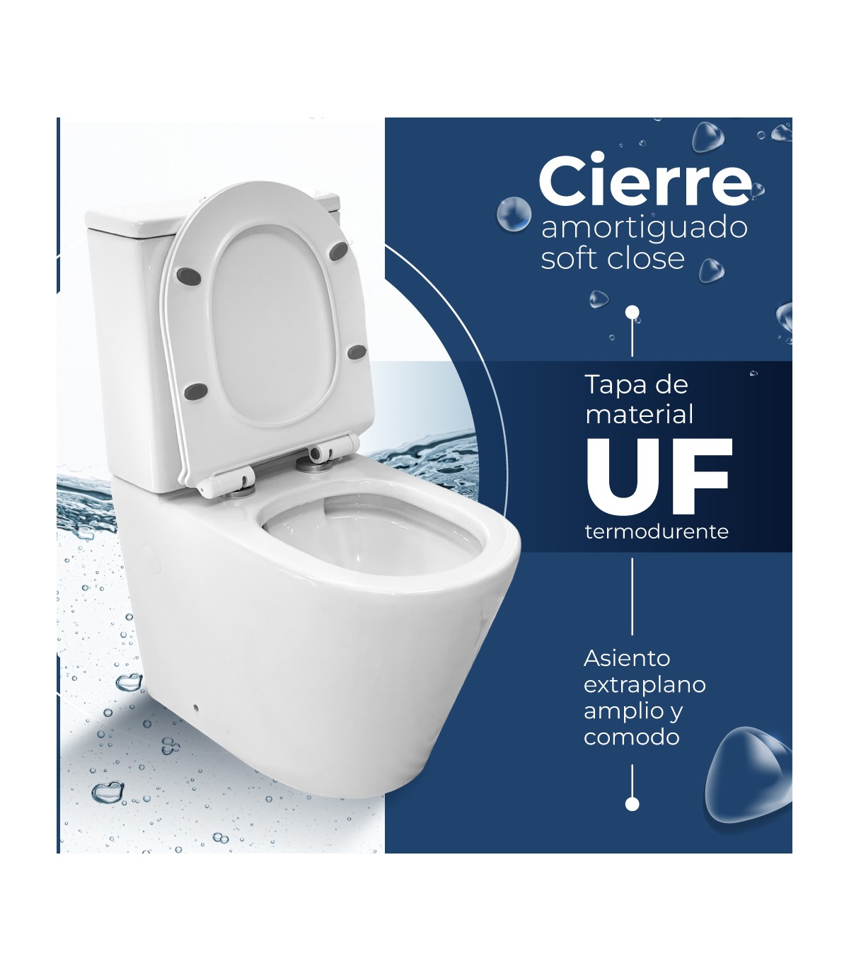 La tapa amortiguada UF garantiza un cierre suave y silencioso, aportando mayor confort y durabilidad. El sistema de doble descarga permite reducir el consumo de agua manteniendo un excelente rendimiento.