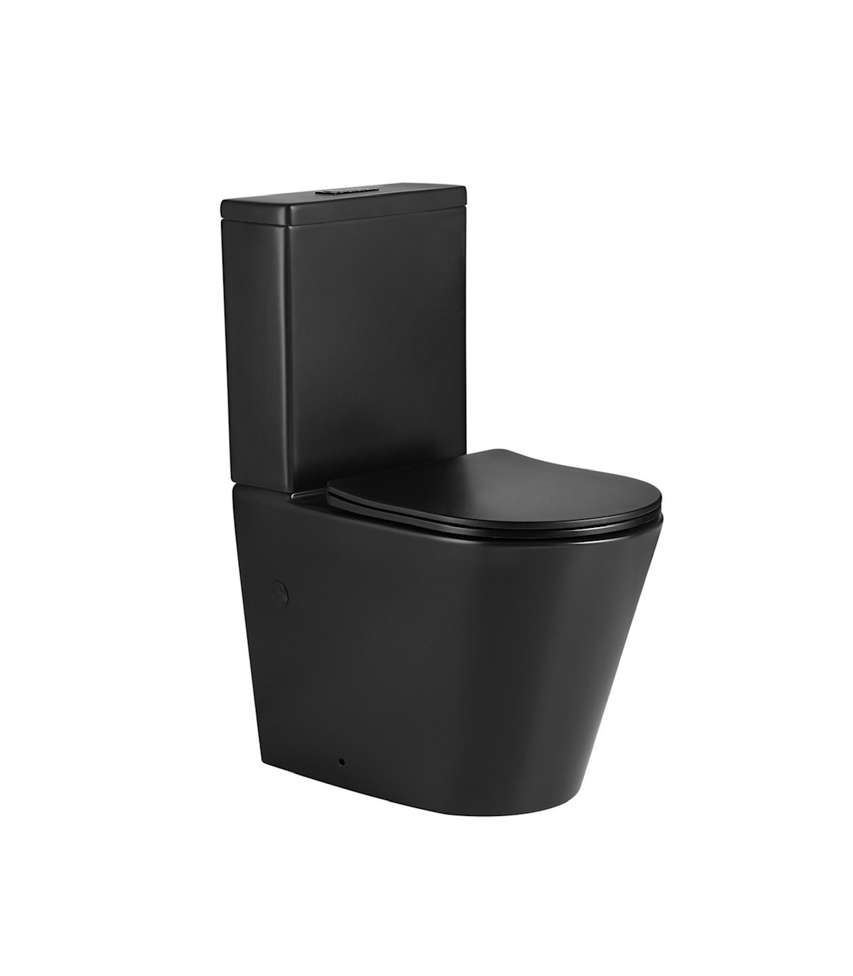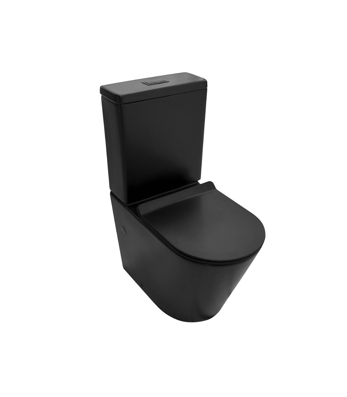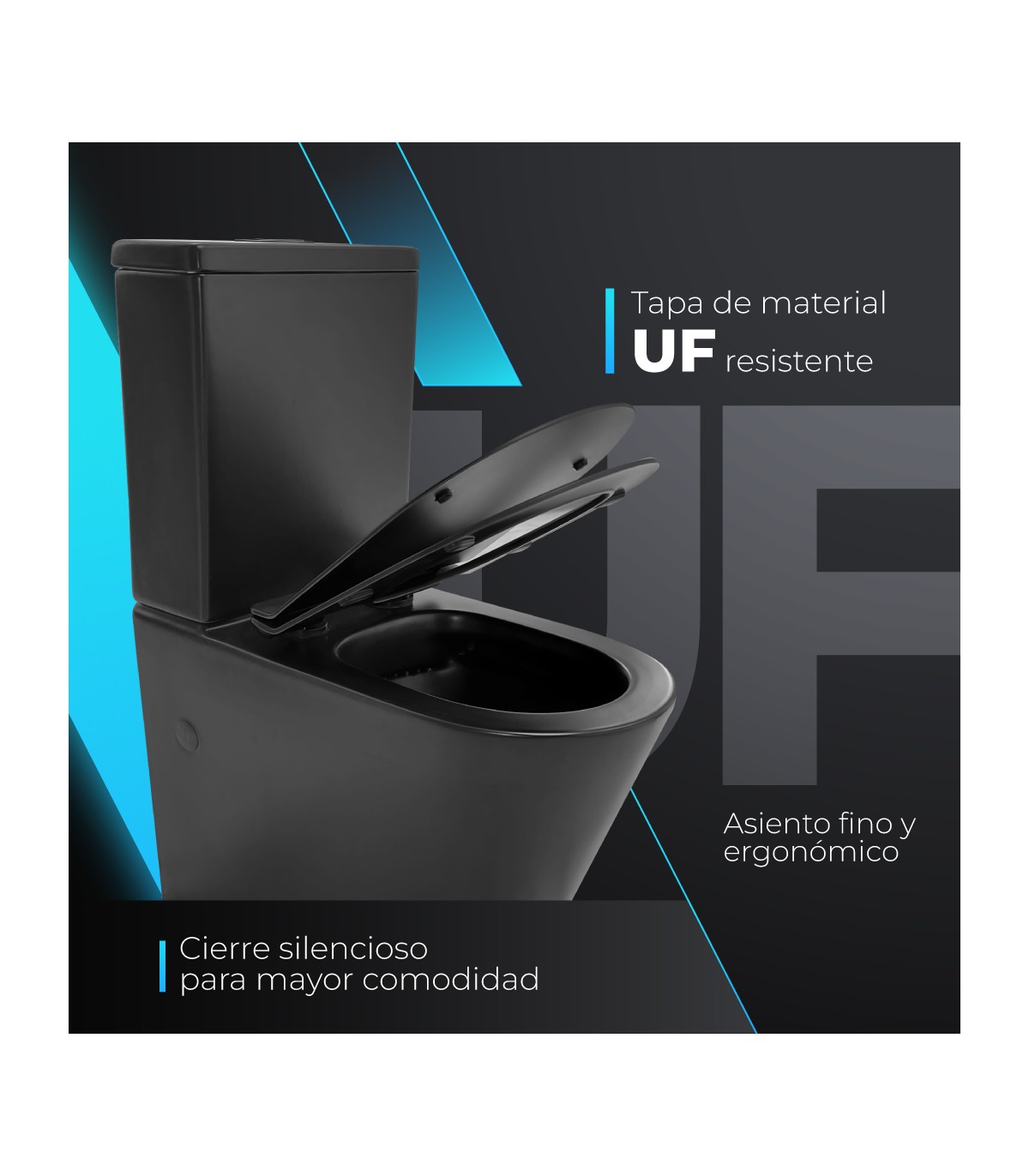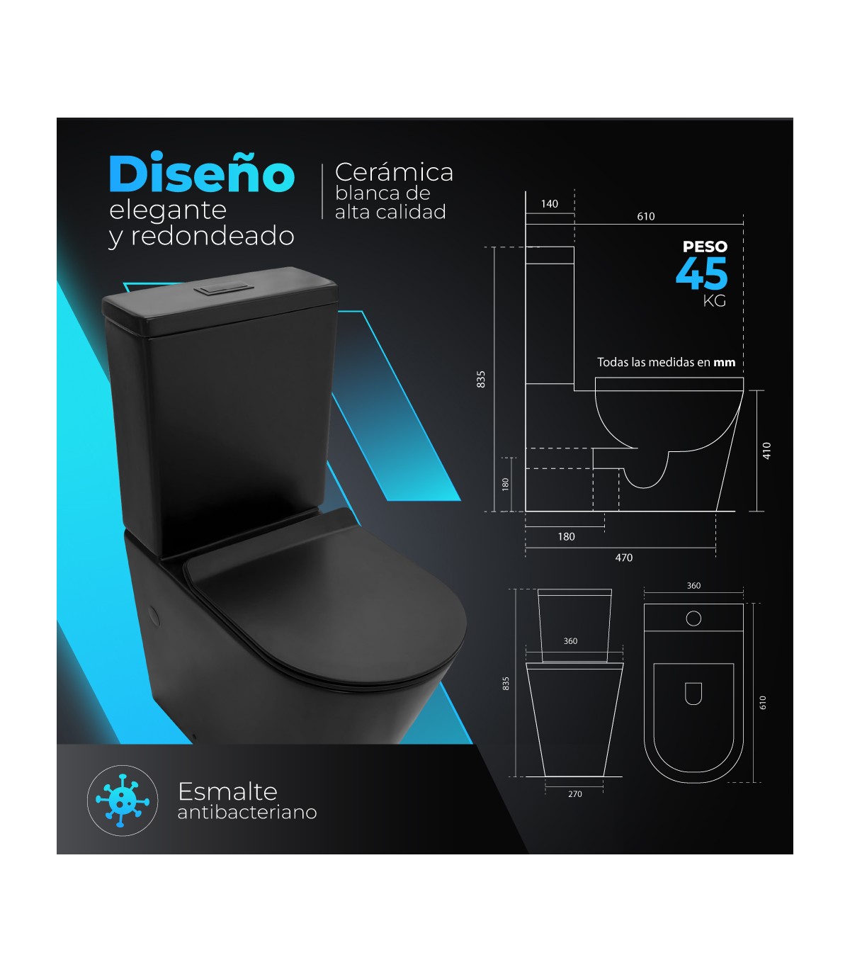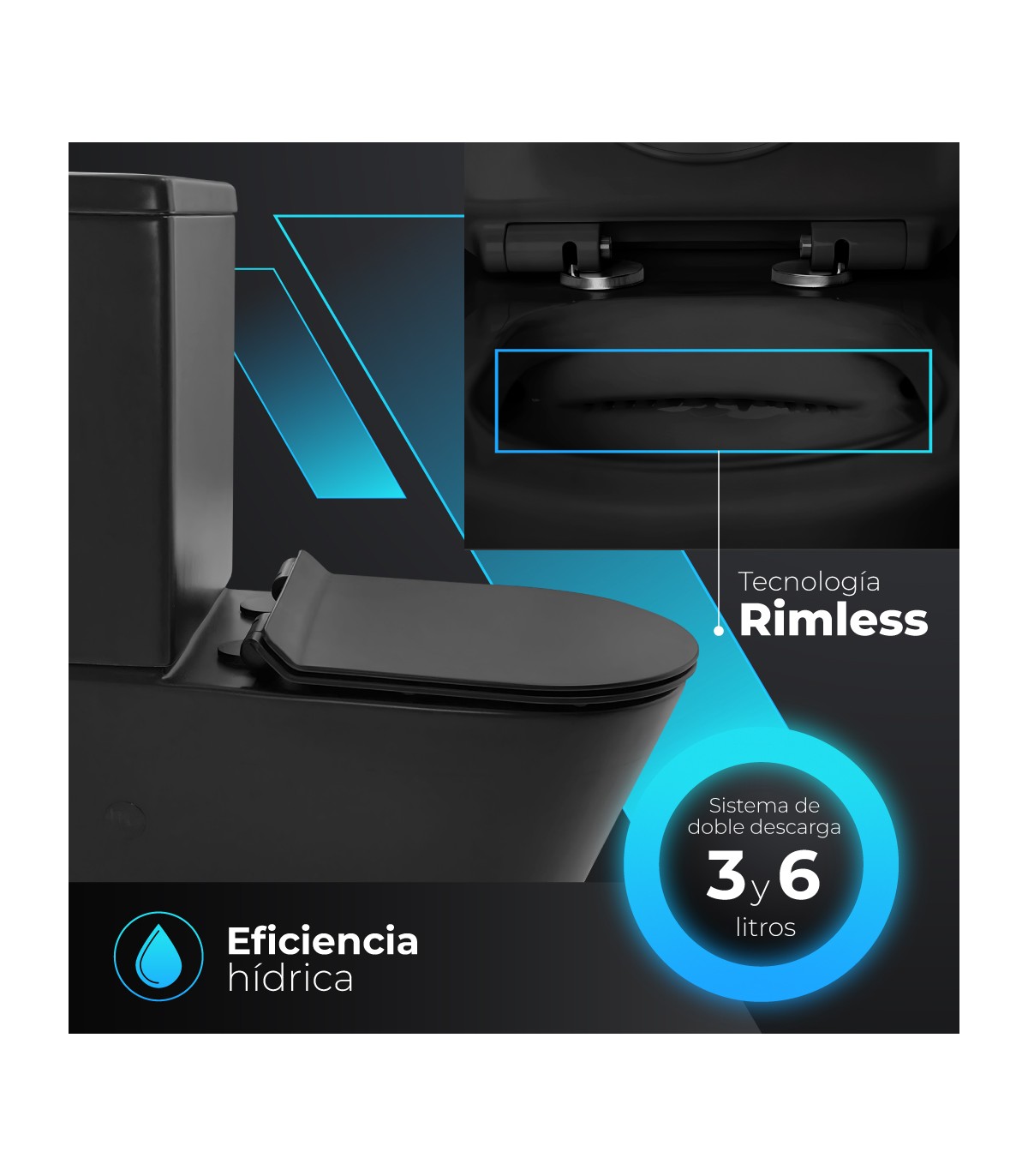 Inodoro completo de cerámica negra Veneto con sistema rimless, doble descarga 3/6 L, salida dual y tapa amortiguada. Diseño moderno, fácil limpieza y entrega rápida 48–72 h.