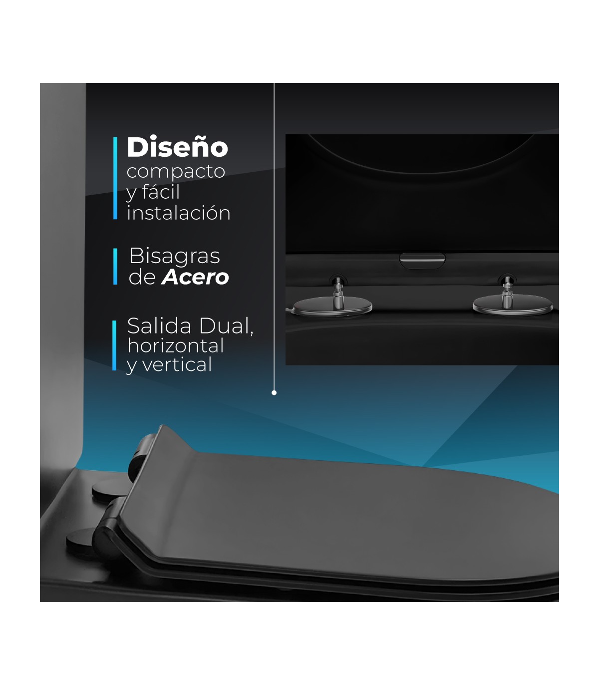 Equipado con un mecanismo de doble descarga 3/6 litros y salida dual (horizontal o vertical), se adapta fácilmente a distintos tipos de instalaciones. La tapa amortiguada proporciona un cierre suave y silencioso, mejorando la experiencia de uso.
