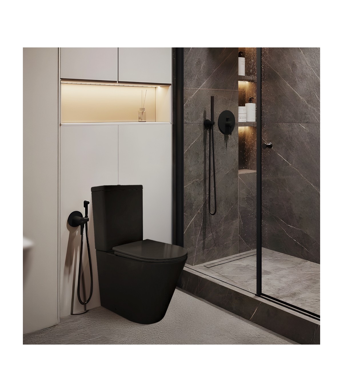 El inodoro completo de cerámica negra Veneto es una solución integral para baños modernos que combina diseño, funcionalidad y alta higiene. Fabricado en porcelana vitrificada de alta calidad, este inodoro destaca por su sistema rimless que elimina la brida tradicional, facilitando la limpieza y evitando acumulaciones de suciedad.