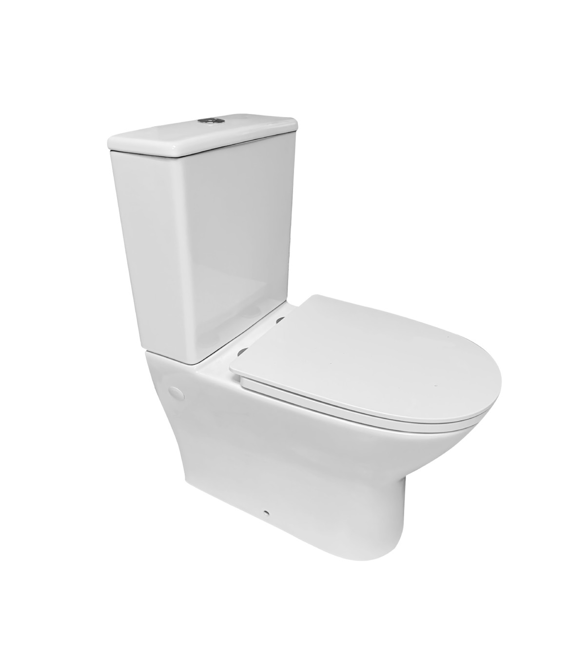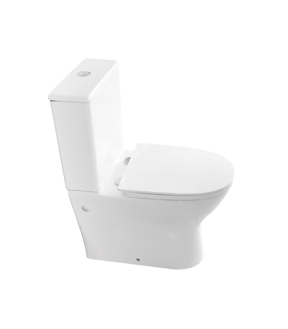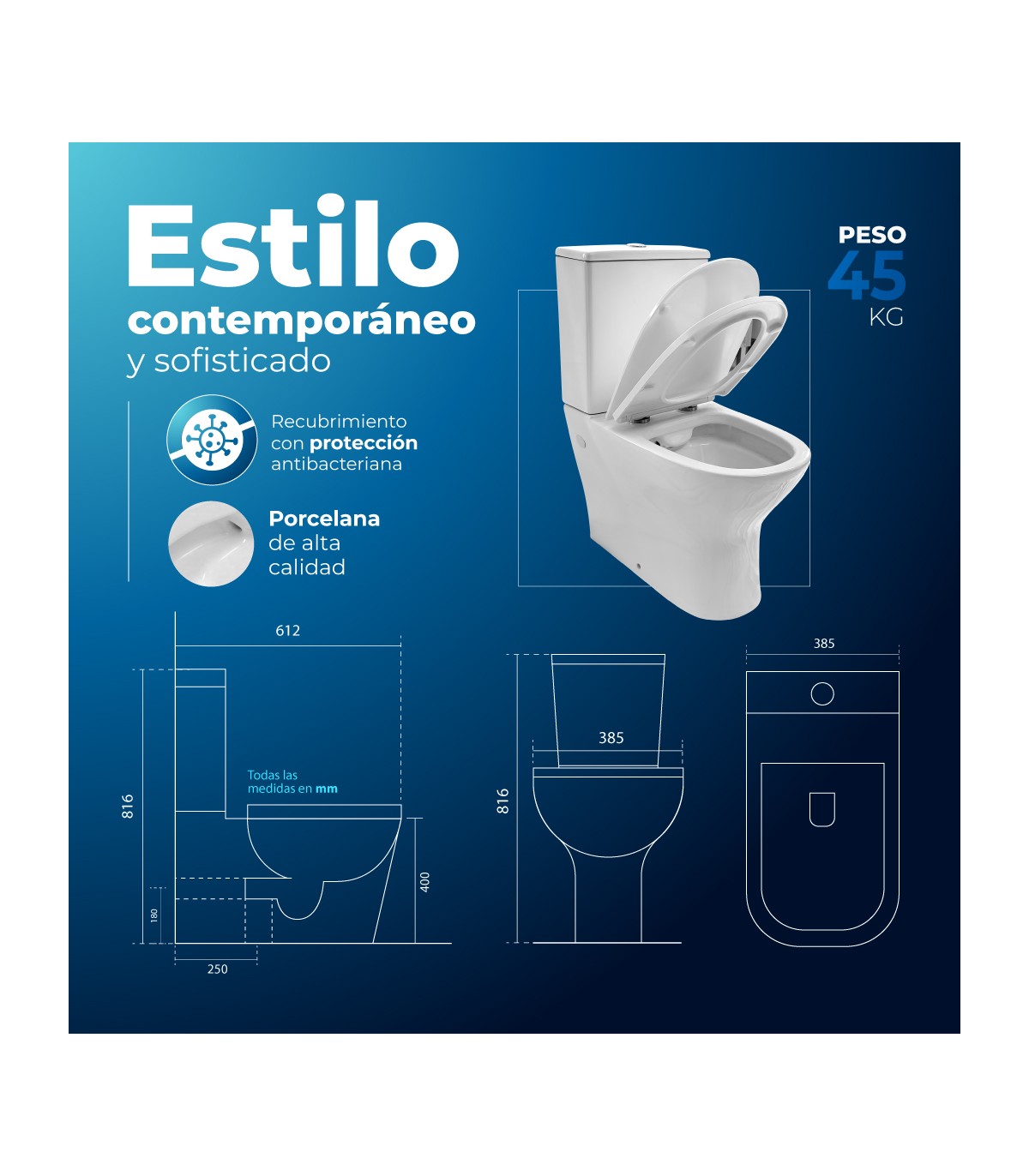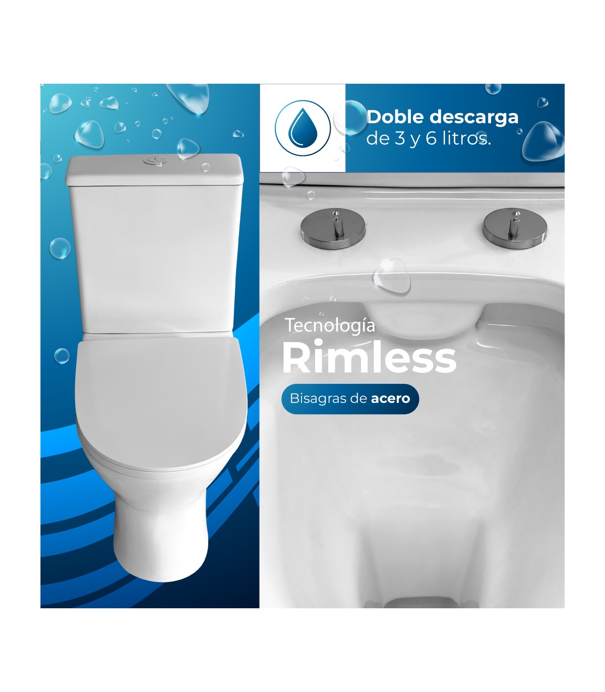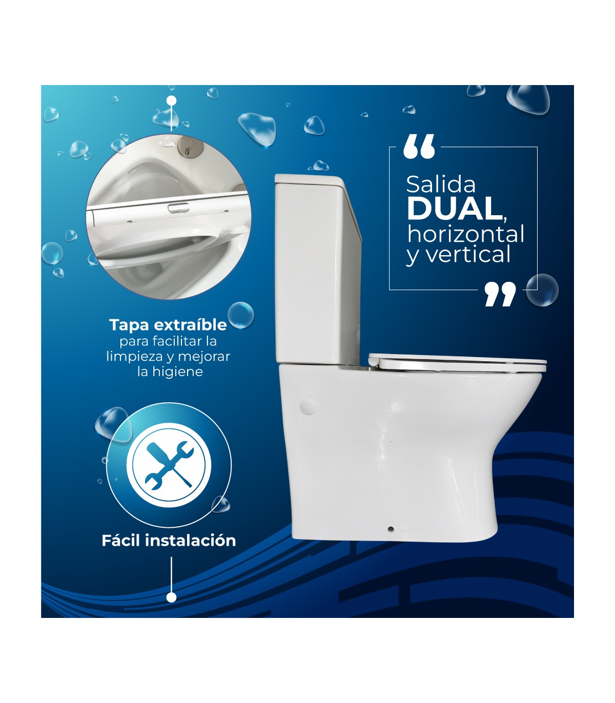 Este modelo incorpora sistema rimless, eliminando la brida interior para mejorar la higiene y facilitar el mantenimiento diario. Gracias a su salida dual, permite una instalación versátil tanto horizontal como vertical.