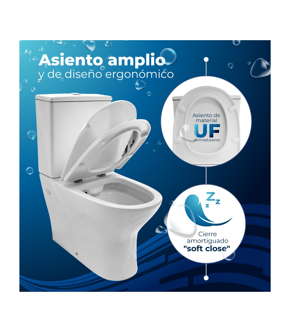 La tapa amortiguada UF proporciona un cierre suave y silencioso, aportando mayor comodidad y durabilidad. El sistema de doble descarga permite optimizar el consumo de agua manteniendo un excelente rendimiento.